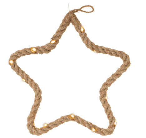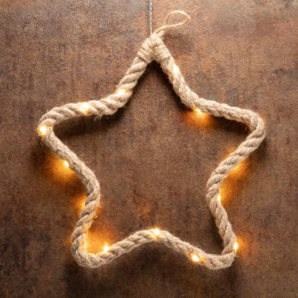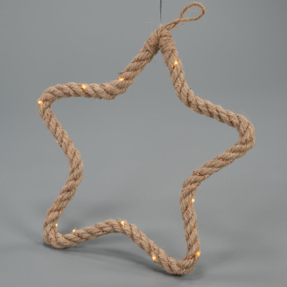 A részletesebb leírás megtekintésePraktikus karácsonyi dekoráció csillag alakú, kenderszállal és ezüst dróttal tekert, 15 meleg fehér LED-del ellátott, akasztható/dekorálható.