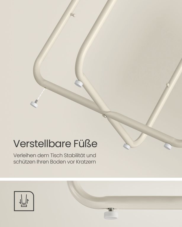 Az asztal tartós forgácslapból és tömör acélból készült, ami stabilitást és tartósságot biztosít. Az összeszerelés gyors és egyszerű a mellékelt utasításoknak köszönhetően. A poliészter kosár vegyszermentes és könnyen tisztítható. Az állítható lábak védik a padlót a karcolásoktól.