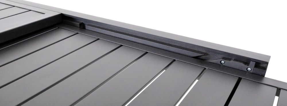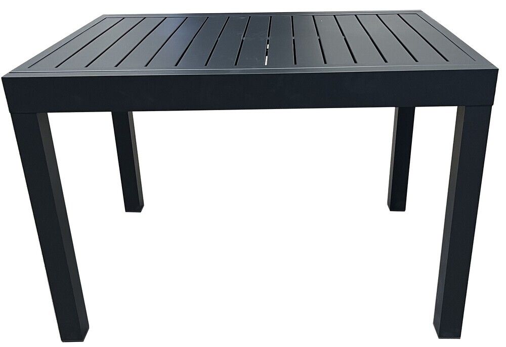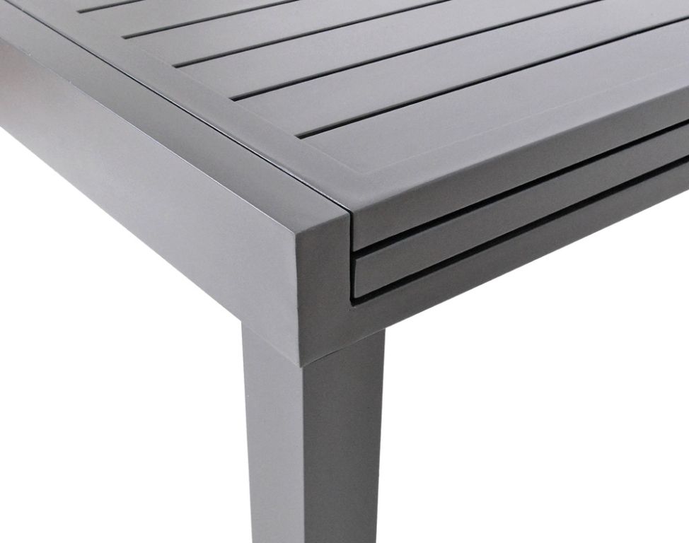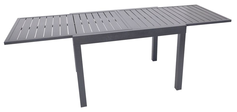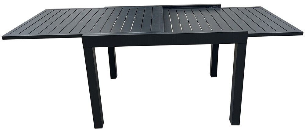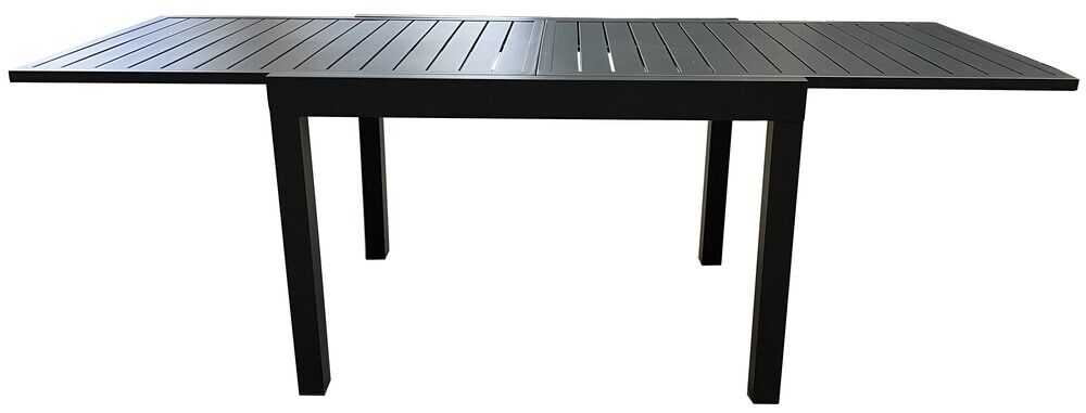 Fekete dizájnú alumínium asztal, amely kihúzható. Modern asztal, amely tökéletesen illeszkedik bármilyen külső vagy belső térbe. A felhasznált anyagoknak és a modern megjelenésnek köszönhetően az asztal igazán széleskörű felhasználási lehetőségekkel rendelkezik, alkalmas beltéri és kültéri terekbe - kertekbe, teraszokra, télikertekbe, vagy esetleg fogadóterembe vagy recepcióra. Az egyszerű összeszerelésnek köszönhetően egy idő után teljes mértékben ki tudja majd használni az asztalt. A kibontási mechanizmus is egyszerű.