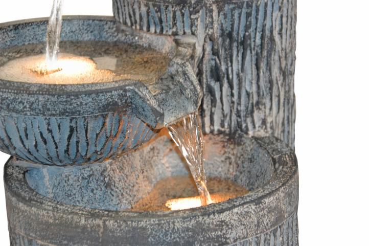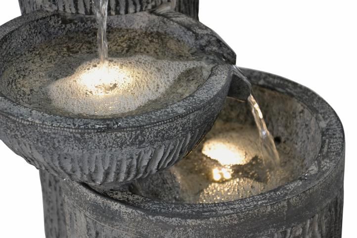 A szökőkút rejtélyt és nyugalmat teremt minden kertben, télikertben és a ház belső helységeiben is. Vízeséshez hasonlítva folyik le a víz a szökőkút tetejéről két megvilágított tálon keresztül. Elektromos szivattyú a csomag tartalma, mely biztosítja víz folyamatos körforgását.