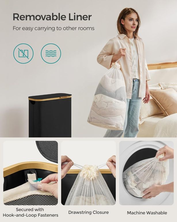 Fedezze fel az elegáns megoldást a napi mosáshoz ez a keskeny mosókosár stílusos bambusz szegéllyel még a kis helyiségeket is hangulatos hellyé varázsolja. A 65 literes űrtartalom elegendő helyet biztosít az egész család számára, míg a praktikus fedél védi a magánszféráját és elrejti a mosnivalót a kíváncsiskodó tekintetek és a por elől.