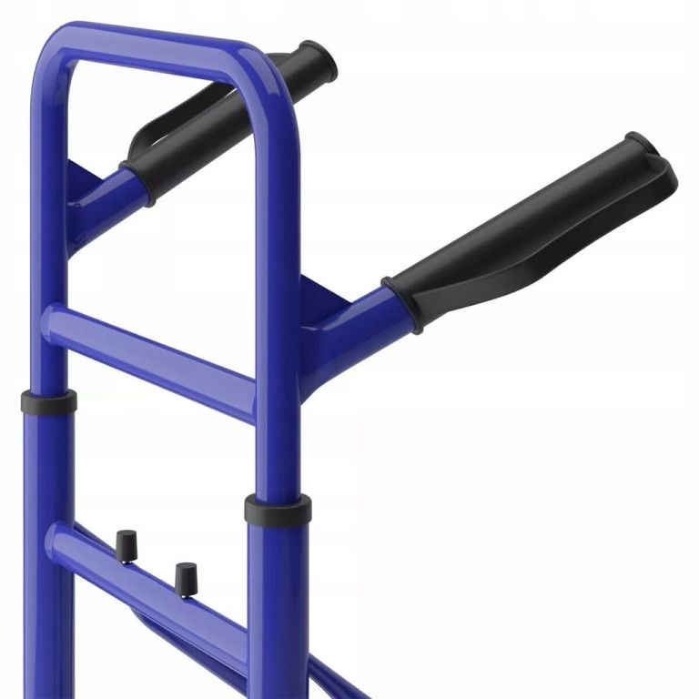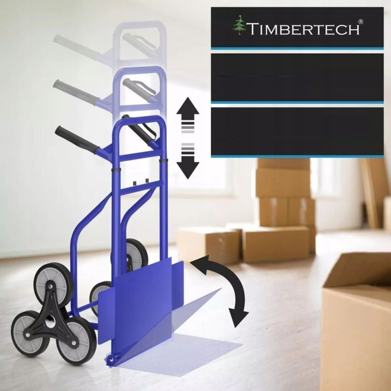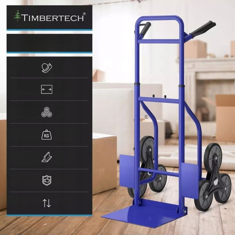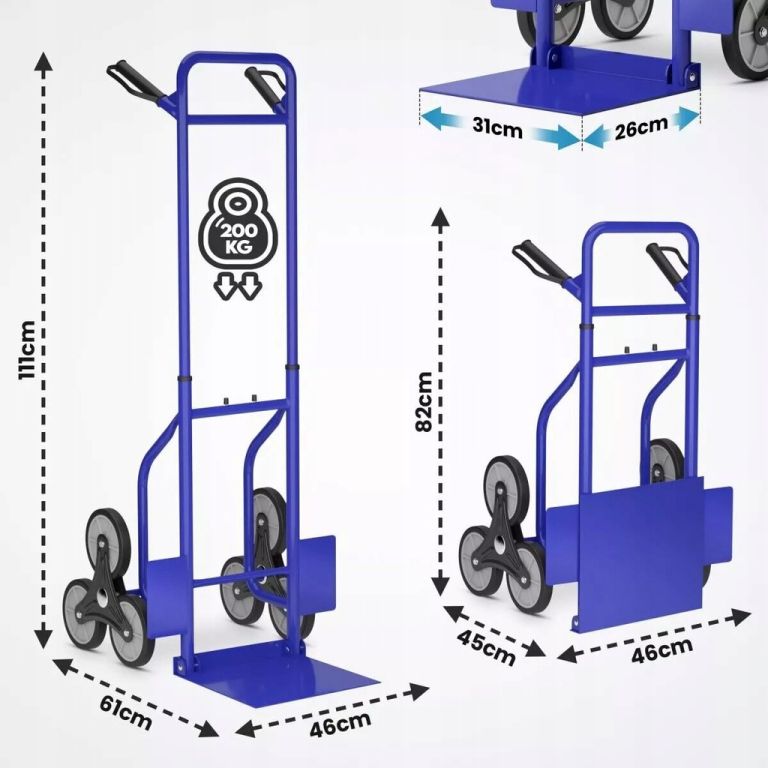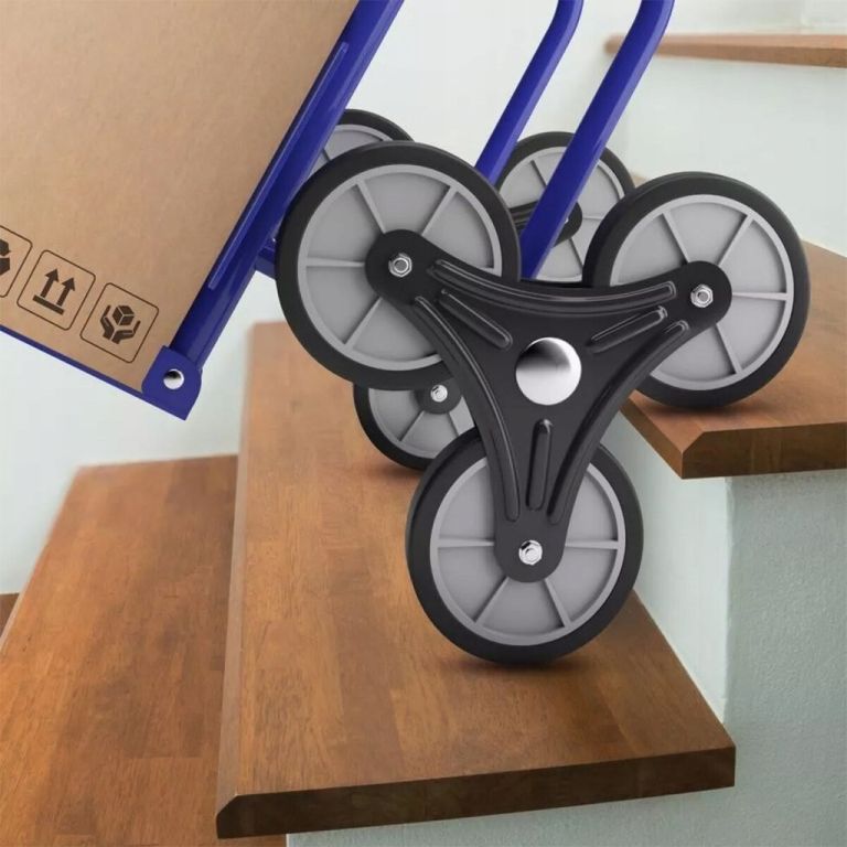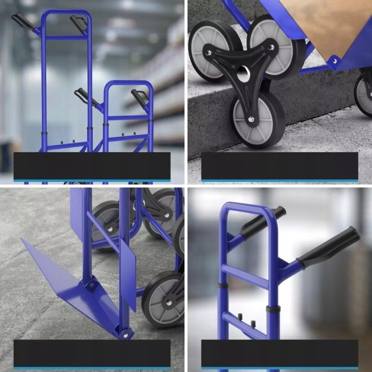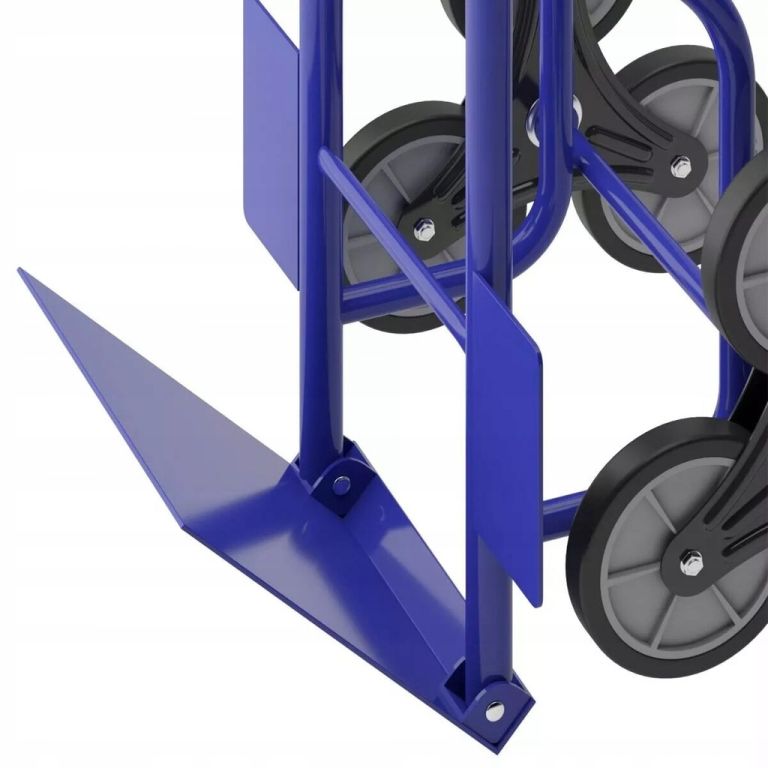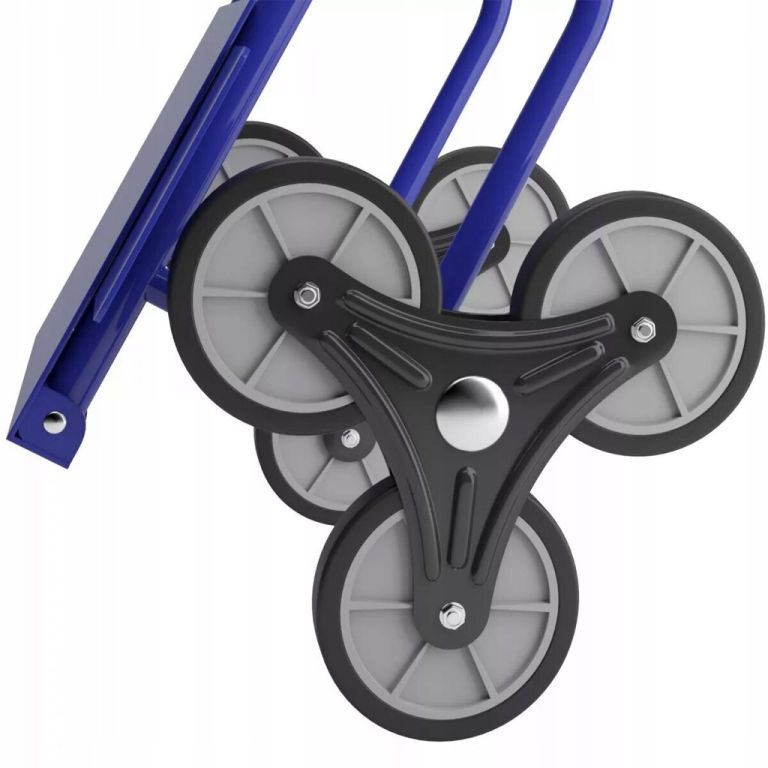 Az acél és alumínium konstrukció akár 200 kg-os terhelést is elbír. A kb. 16 cm átmérőjű háromkerekű gumikerekek könnyedén leküzdik a lépcsőket, a szegélyeket és az egyenetlen terepet. A csúszásgátló gumival ellátott fogantyúk biztonságos fogást garantálnak még teljesen megrakott állapotban is. Az összecsukható pengének és a kompakt kialakításnak köszönhetően a lépcsőlift műhelybe, raktárba és otthoni használatra is alkalmas.