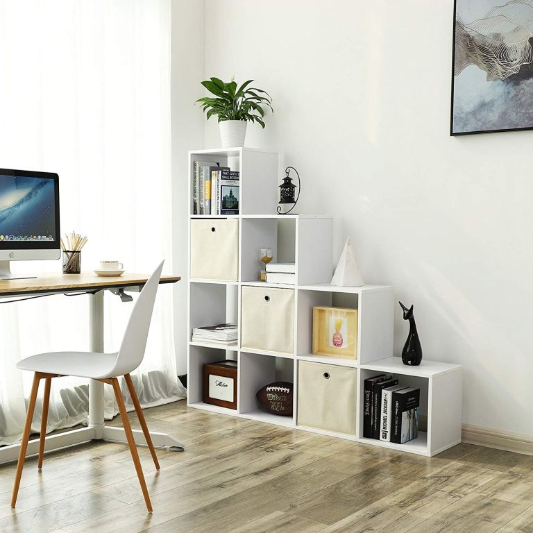 Fehér könyvespolc 10 polccal, alkalmas könyvek, dekorációk és térelválasztó tárolására, könnyen összeszerelhető.