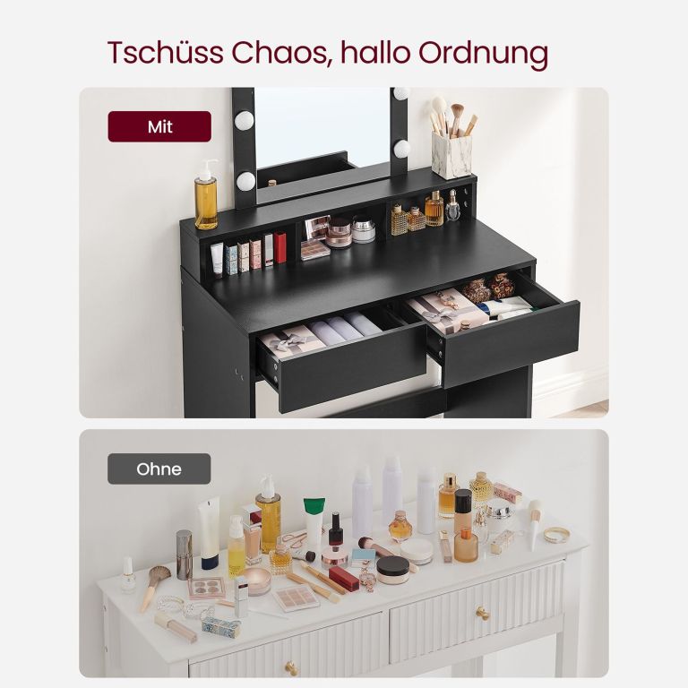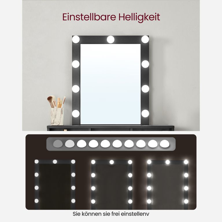 Váltsd élménnyé a mindennapi sminkelést ezzel a modern LED-világítású fésülködőasztallal. Kilenc állítható lámpa segít megtalálni az ideális fényerőt a tökéletes sminkeléshez, míg az átgondolt tárolóhelyek mindent a helyén tartanak. Az elegáns fekete dizájn tökéletesen kiegészít bármilyen belső teret, és kedvenc szépségápolási sarokká válik.