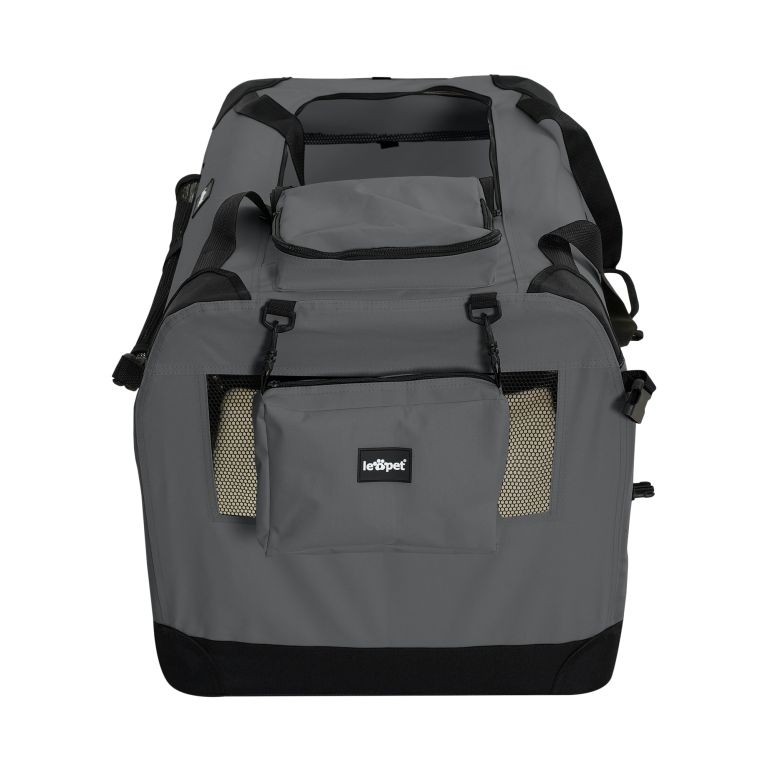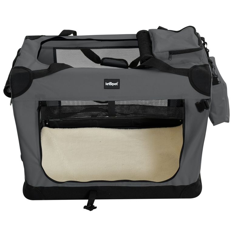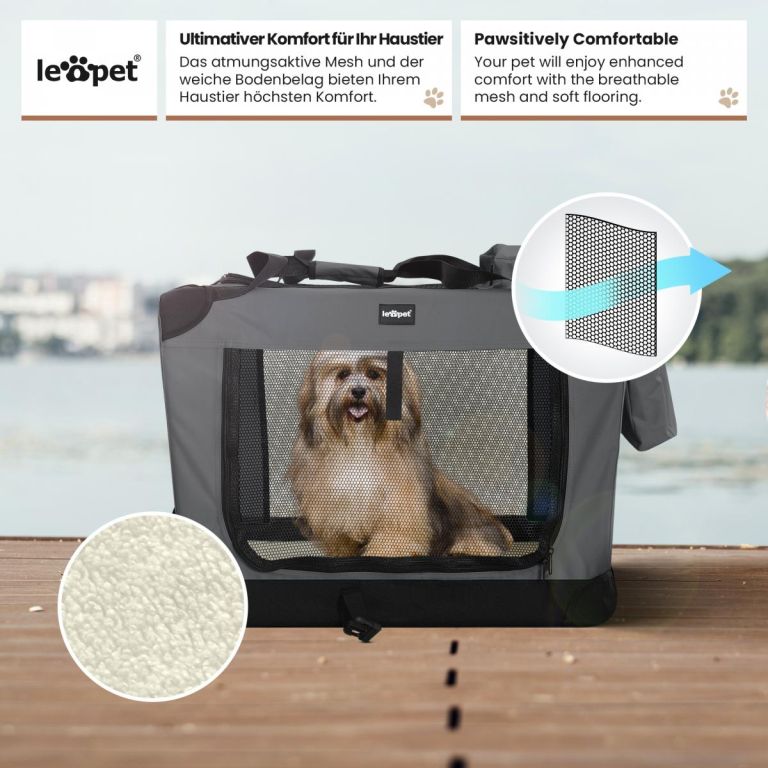 Összecsukható kutyaláda ergonomikus fogantyúkkal, mosható alátéttel és tállal. Stresszmentes és maximális kényelemmel utazhat