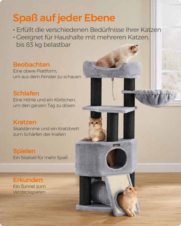 Az elegáns macskafa tökéletes kombinációját kínálja négylábú barátaidnak a kényelem, a szórakozás és a biztonság terén. A nagy, puha plüssszövet borítású fekvőhelyek, a tágas barlang és a mély kosár pihenésre és alvásra csábítanak. Modern, világosszürke kivitelének köszönhetően tökéletesen illeszkedik minden belső térbe.