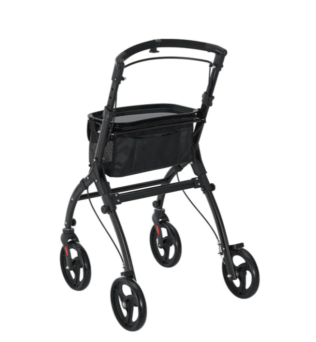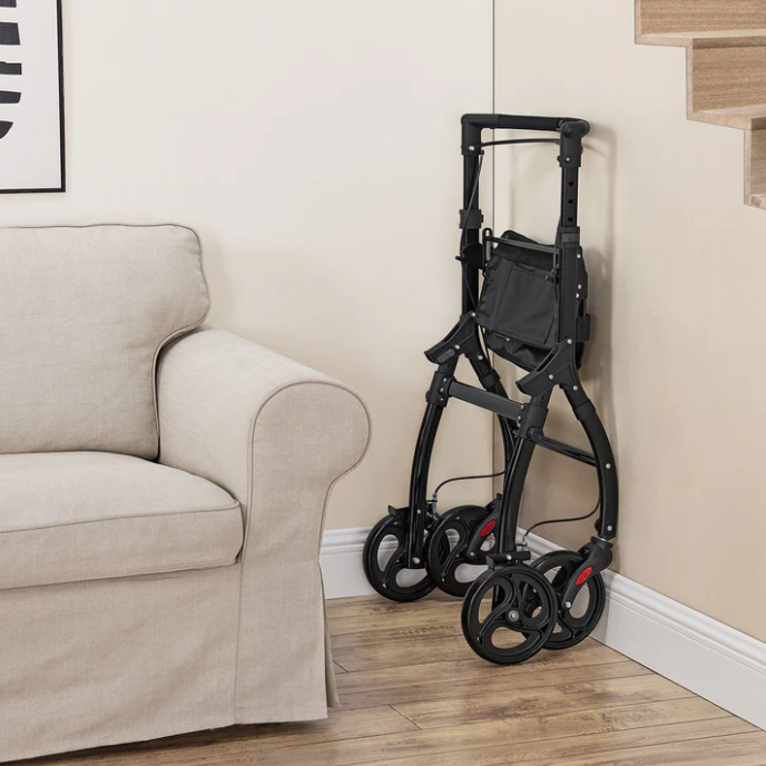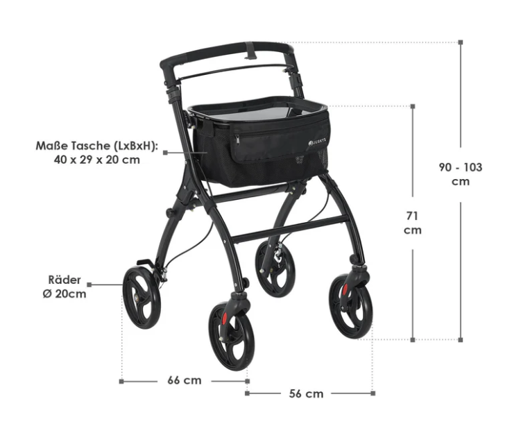 A stabil alumínium konstrukció biztonságot és tartósságot biztosít. Az állítható magasságú fogantyúk az alakjához igazíthatók, míg az egyszerű összecsukható mechanizmus megkönnyíti a tárolást és a szállítást. A járókeret megbízható fékkel van felszerelve a maximális biztonság érdekében lakásban történő használat esetén.