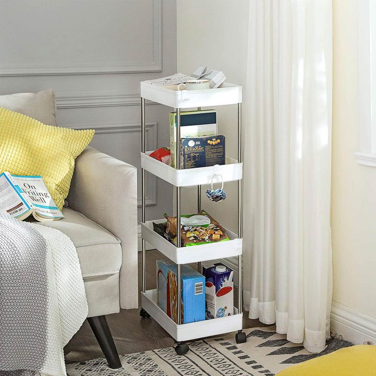 Nincs több rendetlenség! Ez a keskeny, kerekes polc segít rendszerezni a fürdőszobát, a konyhát és az irodát. A négy polcnak és a hat akasztónak köszönhetően mindig minden kéznél lesz, és otthonod új rendet nyer. Ráadásul az elegáns fehér dizájn tökéletesen illeszkedik bármilyen belső térbe.