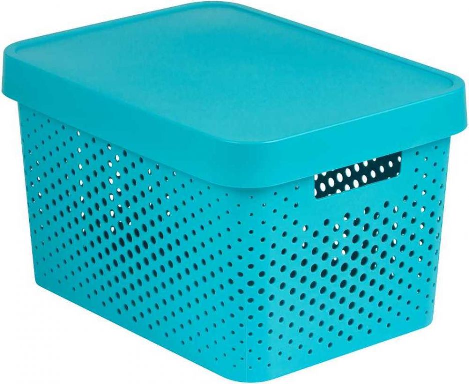 A Curver INFINITY DOTS 17 literes kék színű tárolódoboz tökéletesen illeszkedik minden otthonba. A skandináv stílus ihlette, észrevétlen, mégis elegáns kialakításának köszönhetően nemcsak a gardróbban, a fürdőszobában vagy a hálószobában, hanem otthonod más helyiségeiben is használható. Gyorsan belepakolhatsz számos dolgot, amelyeket el kell tenni, hogy ne porosodjanak, de azért levegőzzenek. Utóbbit a lyukacsos kivitelezés biztosítja, amely nemcsak praktikus, hanem ötletes is. A doboz kiváló minőségű, tartós műanyagból készül. Az oldalsó fogantyúk biztosítják a tárolódoboz egyszerű kezelését. Könnyedén mozgathatod a dobozt bárhova, ahol szükséged van rá.