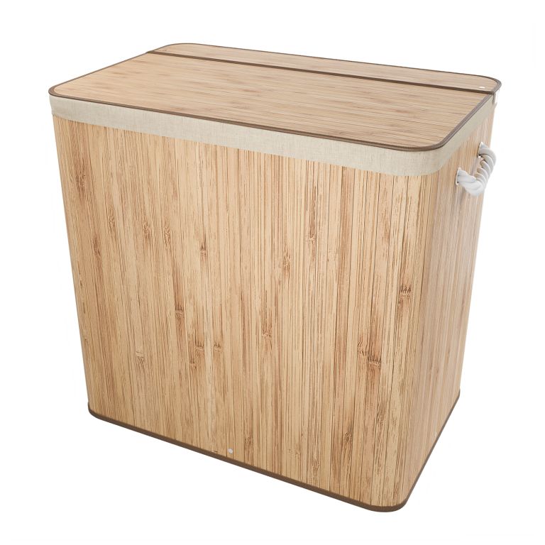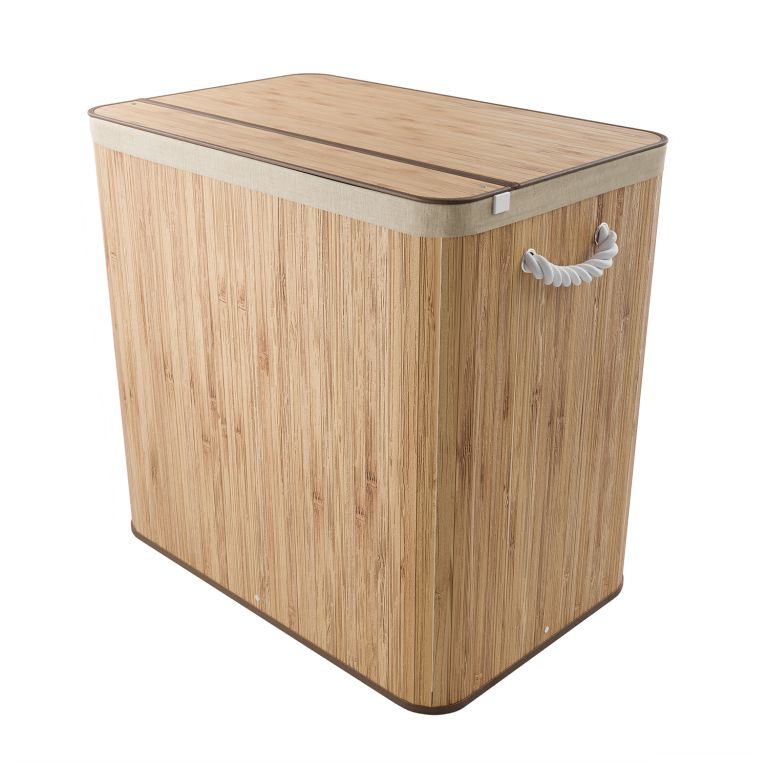 A részletesebb leírás megtekintéseXXL méretű, 150 literes szennyeskosár bambusz dizájnnal, fedéllel és három rekesszel a fehér és színes ruhák egyszerű szétválogatásához.