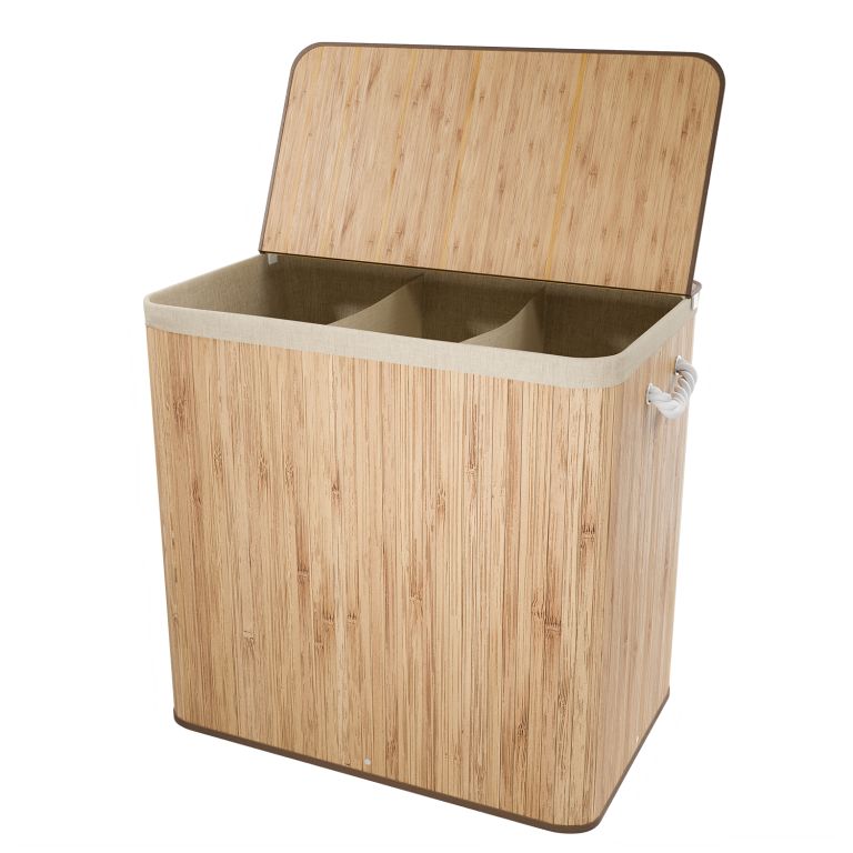 XXL méretű, 150 literes szennyeskosár bambusz dizájnnal, fedéllel és három rekesszel a fehér és színes ruhák egyszerű szétválogatásához.