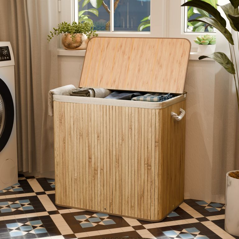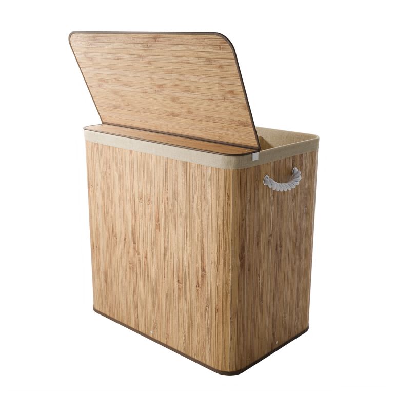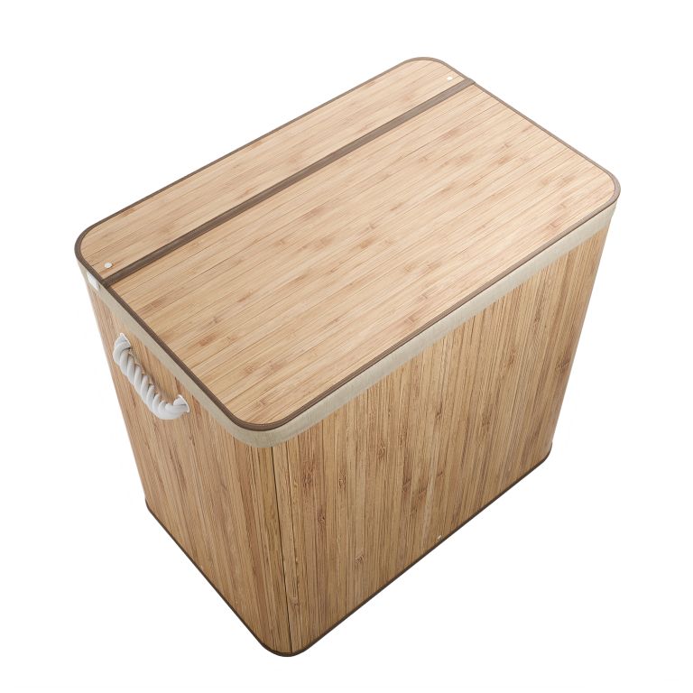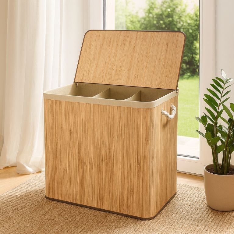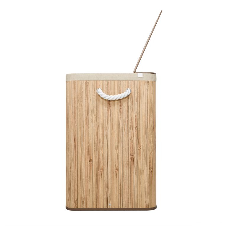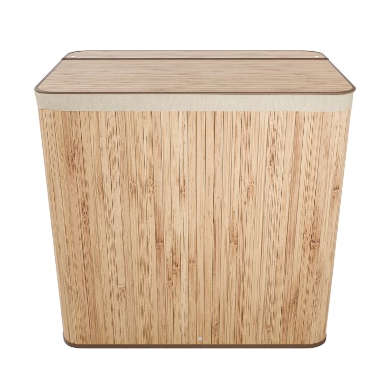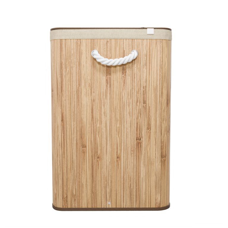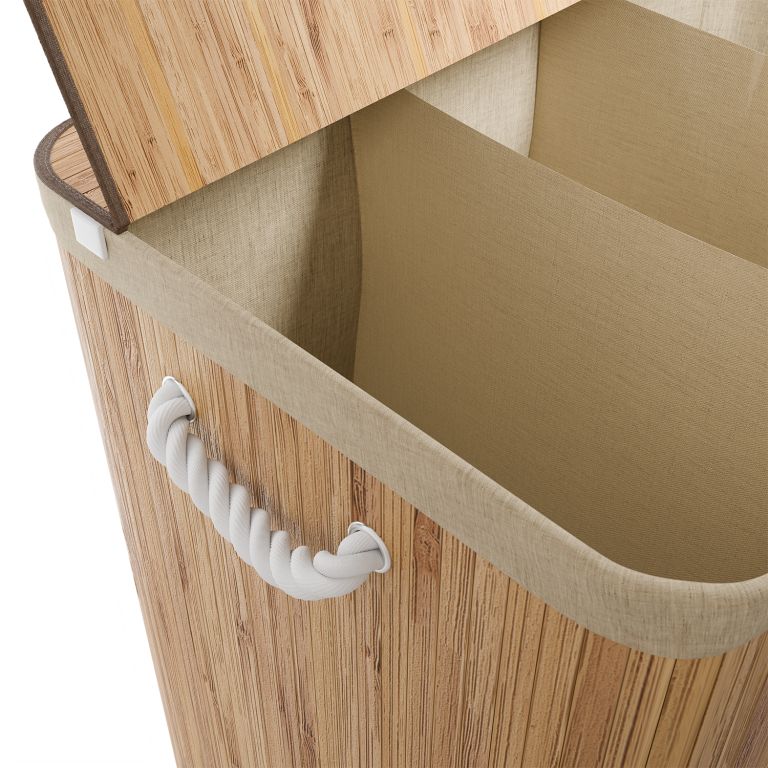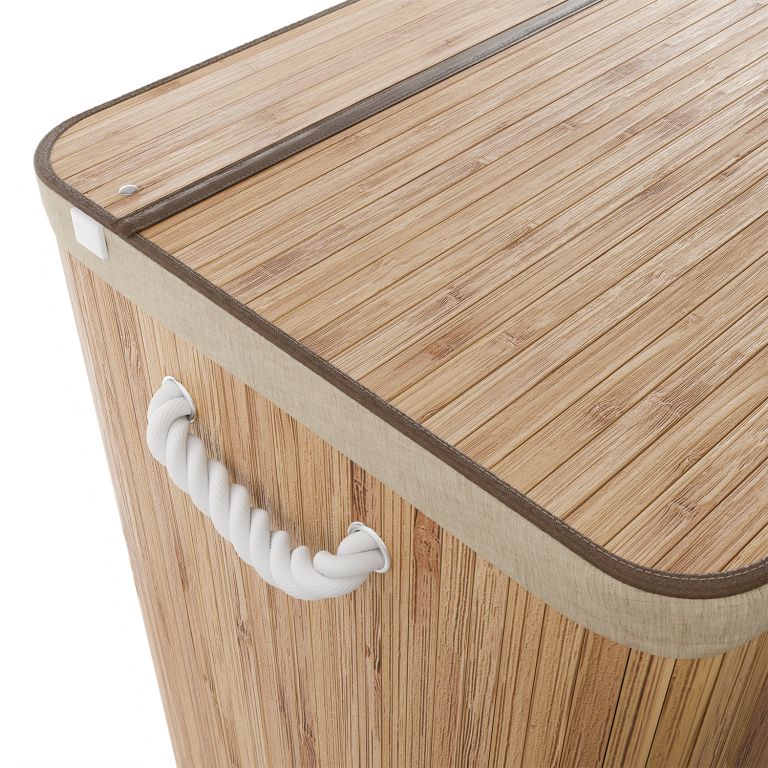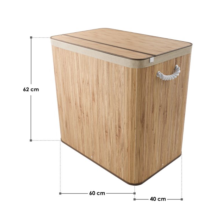 A robusztus bambusz konstrukciót egy kivehető textilzsák egészíti ki, amely könnyen mosható. Az oldalsó fogantyúk megkönnyítik a hordozást, a fedél pedig biztosítja, hogy a ruhák diszkréten rejtve maradjanak, kellemetlen szagok nélkül. Ez a szennyestartó kosár ideális megoldás családok és mindazok számára, akik a funkcionalitást az esztétikával szeretnék ötvözni.