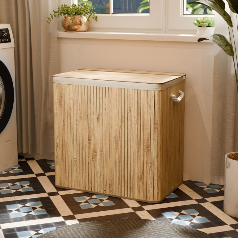 Fedezzen fel egy praktikus és stílusos módot arra, hogy mindig kézben tartsa a ruháit. A 150 literes bambusz szennyestartó kosár természetes eleganciát visz otthonába, miközben rengeteg helyet biztosít a mindennapi igényekhez. A három különálló rekesznek köszönhetően a szennyes ruhákat azonnal szétválogathatja, amint elpakolja őket, így a mosás gyorsabb és könnyebb.