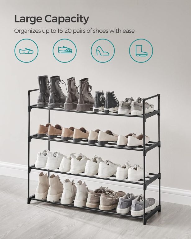 Négy szintes fekete cipőtartó, amely gyorsan összeszerelhető és helytakarékos.
