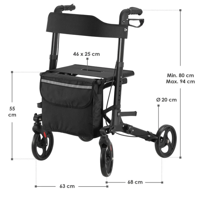 Könnyű, de erős alumíniumból készült, ami megkönnyíti a kezelését és szállítását. Az összecsukható mechanizmus lehetővé teszi a könnyű tárolást, az állítható magasságú fogantyúk alkalmazkodnak a testhez, a megbízható fékek pedig biztonságot nyújtanak még egyenetlen terepen is.