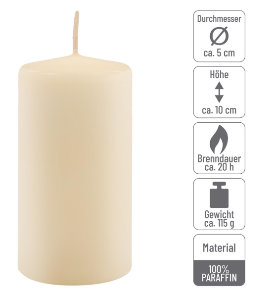 A gyertyák 100% paraffinból készültek, sima felületűek és nem tartalmaznak illatanyag-adalékanyagokat. Az 5 cm-es átmérő és a 10 cm-es magasság hosszú égési időt biztosít - akár 20 órát gyertyánként. A könnyű, ismételt meggyújtást és az egyenletes égést mindenki értékelni fogja, aki a minőséget és a megbízhatóságot keresi.