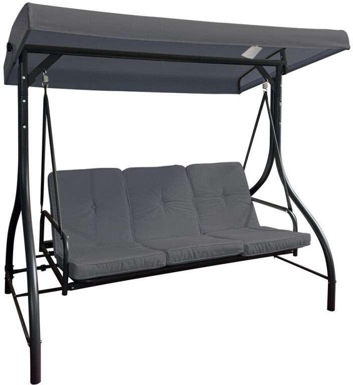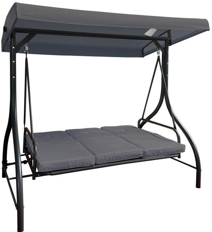 Stílusos és kényelmes kerti hinta masszív és stabil fémszerkezettel fekvő helyzetbe kihajtható a még nagyobb pihenés érdekében. A hinta párnákat tartalmaz ezek egy fémkeretre felfűzött szövetre vannak fektetve. Porszórt acélszerkezet, párnák (vízálló poliészter 160 g), töltelék poliészter vatta 8 cm, baldachin (vízálló poliészter 180 g), 3 fő részére Ágyként kibontható.
