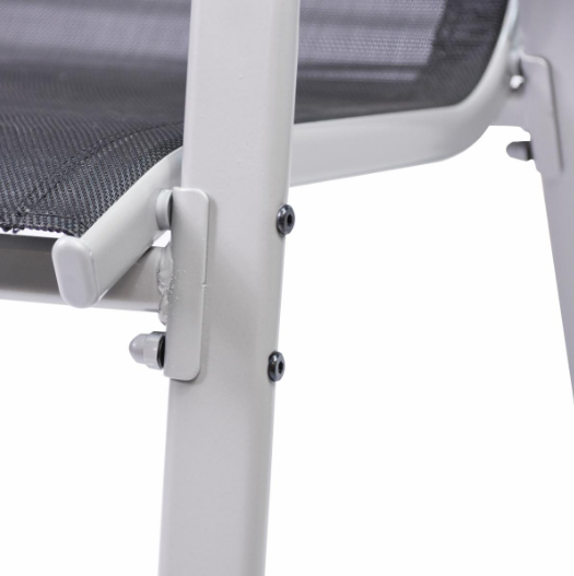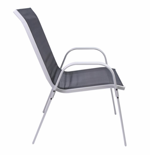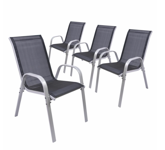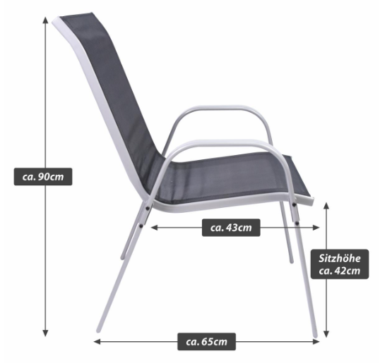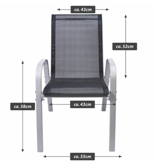 Ezek a robusztus székek egymásra rakható acélvázat és fekete textilén szövést ötvöznek időjárásálló és kevés karbantartást igénylő anyagok. 90 × 55 × 65 cm méretükkel és 42 cm ülésmagasságukkal masszív és kényelmes ülést biztosítanak. Tökéletesen egymásra rakhatók és helytakarékosak, ideálisak praktikus használatra a kertben és otthon.