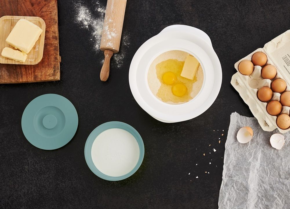 Praktikus 2 db edényből álló készlet fedővel és kör alakú rögzítéssel a tésztával való munka közbeni fröccsenés megakadályozására. Tökéletes segítő a keveréshez és a keveréshez. Ergonomikus fogantyú és csúszásmentes gumírozott talp. Mosogatógépben mosható. -20 °C-tól +100 °C-ig használható.