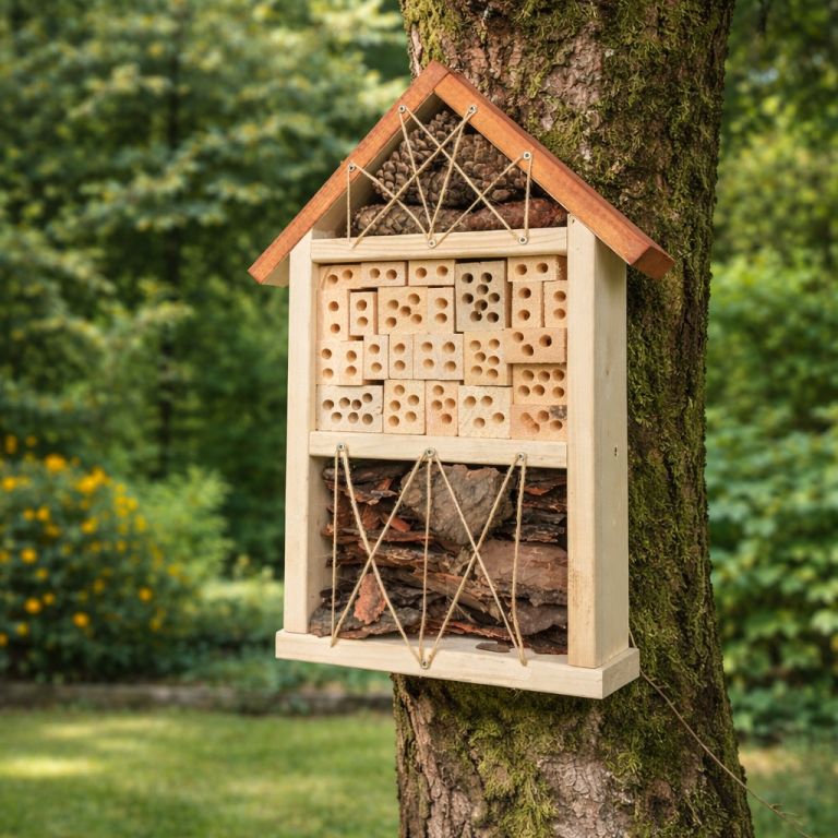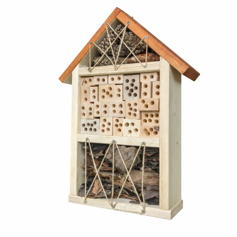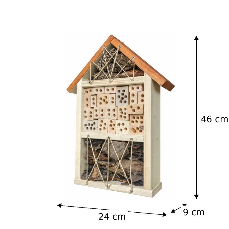 A rovarhotelek leggyakoribb lakói a magányos méhek, amelyek a legfontosabb beporzók közé tartoznak. A magányos méhek mellett a pillangók és a tripszek is menedéket találnak itt, amelyek lárvái elpusztítják a káros rovarokat. Más lakók, mint például az aranyvessző, a katicabogarak és a csillagok, a káros rovarokat, különösen a levéltetveket fogyasztják. Miért van rovarhotel ? A rovarok segítenek nekünk a kártevők (levéltetvek stb.) elleni védekezésben, különösen, ha el akarjuk kerülni a vegyszeres szereket. Az emberek gyakran azt sem tudják, hogy a rovarporzók nélkül nem is kapnánk nagy termést. A legtöbb gyümölcsfának azonban szüksége van rovarokra a beporzáshoz. Hová tegyük a rovarhotelünket ? A földtől magasabban, lehetőleg egy fán vagy falon. A déli oldalra, ahol védve lesz az esőtől és a széltől. Nagyobb területre több hotelt ajánlott elhelyezni.