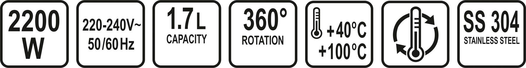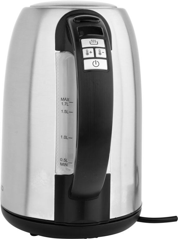 A praktikus, 1850 - 2200 W teljesítményű rozsdamentes acél vízforraló 1,7 l víz gyors felmelegítését biztosítja egy előre beállított hőmérsékletre, amely a fogantyún lévő kezelőpanel segítségével egyszerűen kiválasztható. A készülék tápellátása 70 cm hosszú, 230 V-os kábellel történik.