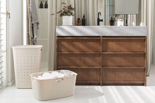 Tiszta szennyeskosár 45 l űrtartalommal. A szövés és a steppelés technikája által inspirált, plasztikus mintázatot létrehozó szövés és steppelés. Kényelmes fogantyúk a kényelmes kezeléshez. 70%-ban újrahasznosított anyagokból készült. Stílusos, mégis praktikus kiegészítő, amely luxusérzetet kölcsönöz az otthonnak.
