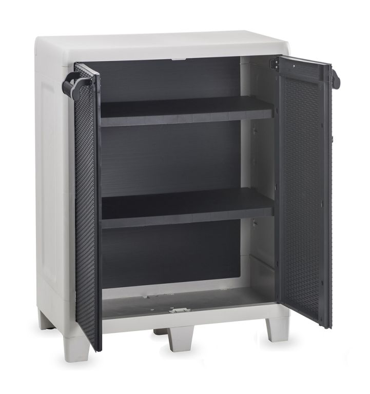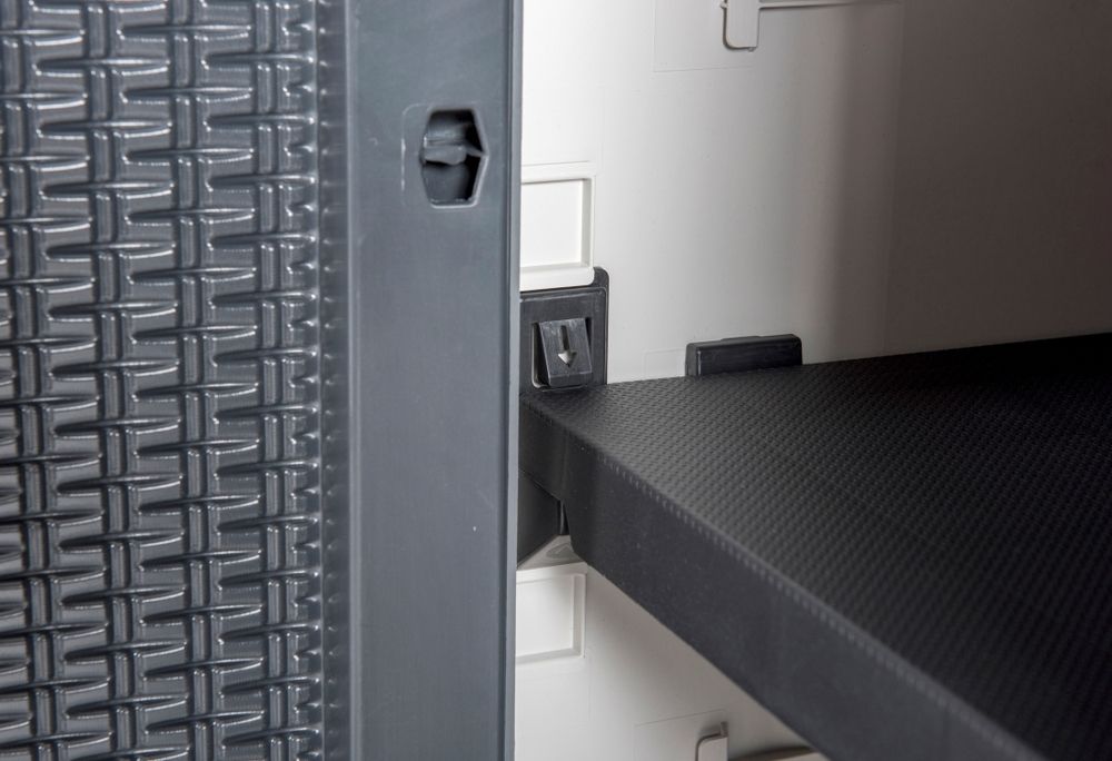 ÁLLÍTHATÓ PADLÓK: A két állítható polc, amelyek maximális terhelhetősége akár 30 kg is lehet, rengeteg helyet kínál szerszámai és tartozékai rendszerezéséhez. A rattan utánzatú felület biztosítja, hogy a szekrény természetesen illeszkedjen kertje zöld környezetébe.