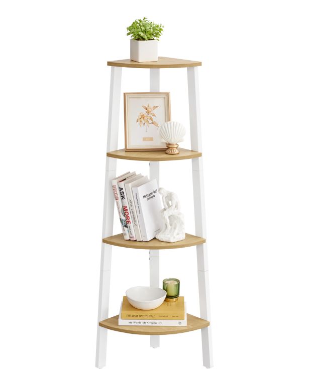 Stílusos sarokpolc négy polccal, természetes tölgy és matt fehér acél kombinációban, minden helyiségbe.