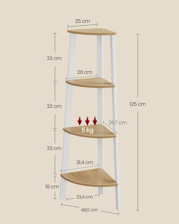Ez a modern sarokpolc nemcsak praktikus, hanem igazán dekoratív megoldás is otthonába. Négy tágas polc tökéletes helyet kínál könyveknek, virágoknak vagy kedvenc dísztárgyainak, miközben elegáns megjelenést kölcsönöz bármely szobának. A természetes tölgy és a matt fehér acél kombinációja melegséget és modern stílust visz a térbe.