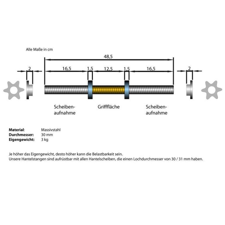 A stabil krómozott acél garantálja a hosszú élettartamot. A markolat 30 mm-es átmérője jól illeszkedik a kézbe, a csillagzárak szilárdan tartják a súlyokat. Könnyű karbantartás és a tárcsák gyors cseréje. Maximális terhelhetőség 50 kg az univerzális használat érdekében.