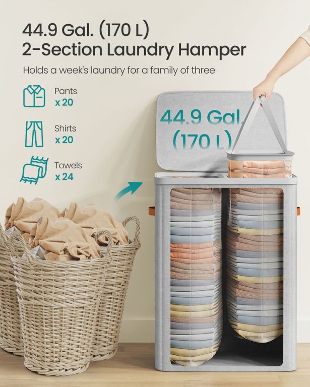 A SONGMICS szennyeskosár ideális megoldás minden háztartás számára. Két különálló, „Világos" és „Sötét" feliratú rekesszel gyorsan szétválogathatja a ruháit és leegyszerűsítheti a dolgát. A kosár 170 literes űrtartalommal rendelkezik, ami elegendő egy heti mosáshoz akár háromfős család számára. A praktikus fedélnek és a kivehető zsákoknak köszönhetően a ruhái védve maradnak, otthona pedig rendezett marad.