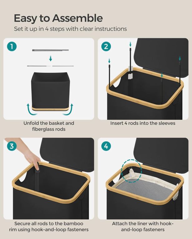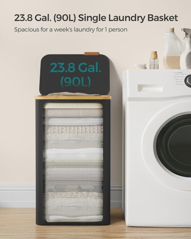 A stílusos, 90 literes SONGMICS szennyeskosár fedéllel, bambusz fogantyúkkal és kivehető betéttel megkönnyíti a mindennapi válogatást és mosást.