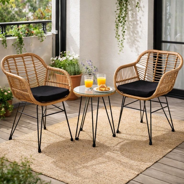 Rattan kinézetű erkélykészletünk beltéri és kültéri használatra egyaránt alkalmas. Az ergonómikusan kialakított székek 5 cm vastag ülésekkel nagyfokú üléskomfortot biztosítanak. A székek és az asztal lábaira szerelhető szintező csavaroknak köszönhetően az egyenetlen padlók nagyon könnyen kiegyenlíthetők. A kerti bútor robusztus váza horganyzott és porszórt fémből, a könnyen karbantartható fonott kiváló minőségű polirattanból készült.