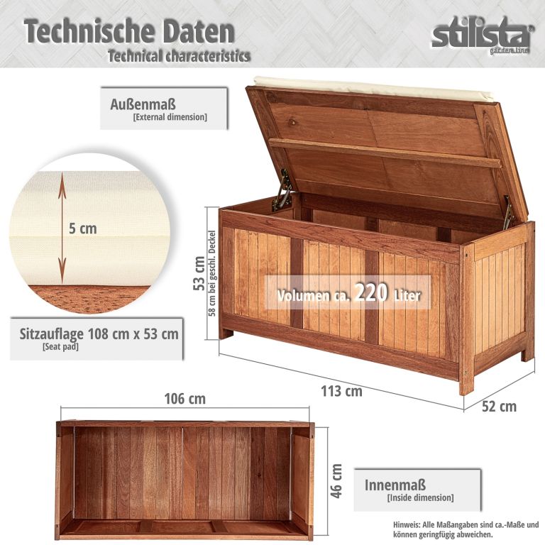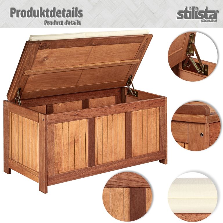 Kerti láda elegáns kivitelben, teakfa-szerű megjelenéssel. Tárolóhelye kerti szerszámok, játékok és egyéb alapvető dolgok tárolására használható. A kényelmes párnázásnak köszönhetően a ládát padként is használhatja. A doboz fedele biztonságosan nyitva marad a kívánt pozícióban, anélkül, hogy leesne. A felhasznált fa FSC tanúsítvánnyal rendelkezik, ami garantálja a környezetbarátságot.