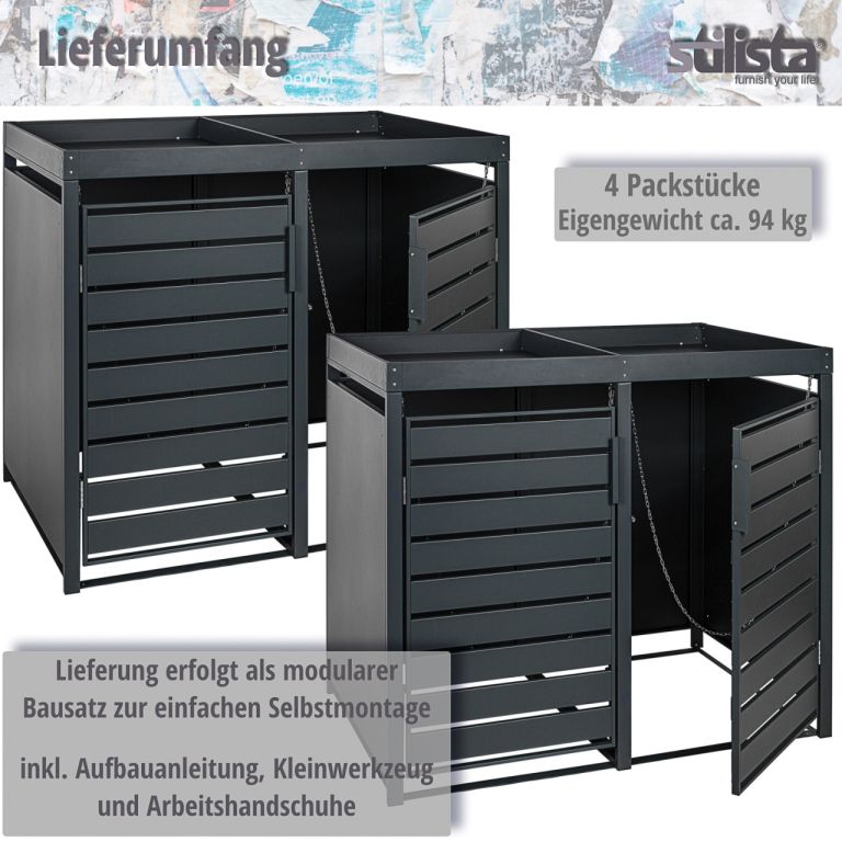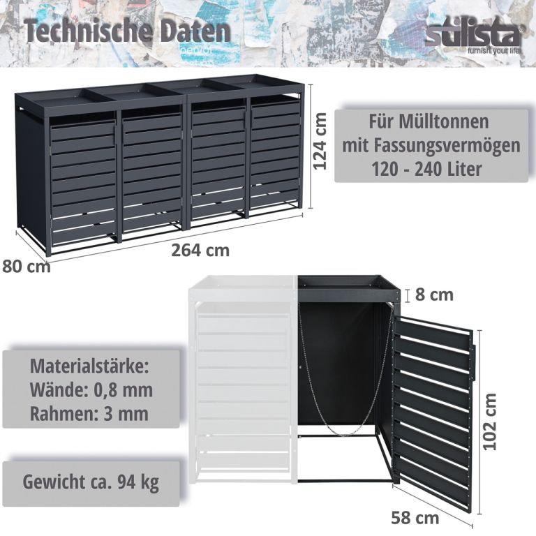 A STILISTA hulladékgyűjtő szekrény négy, akár 240 literes kapacitású hulladékgyűjtőnek kínál helyet. A kukaszekrény tetején található növényrekeszeknek köszönhetően tetszés szerint díszítheti. A növények számára kialakított vízelvezető lyukak a tetőn lehetővé teszik a jobb vízelvezetést, így a virágokat és fűszernövényeket nem fenyegeti a pangó víz veszélye. A hasznos szellőzőnyílások lehetővé teszik a levegő keringését, és megakadályozzák a kellemetlen szagok kialakulását a burkolatban. A szemetesház egy, két, három vagy négy szemeteshez kapható.