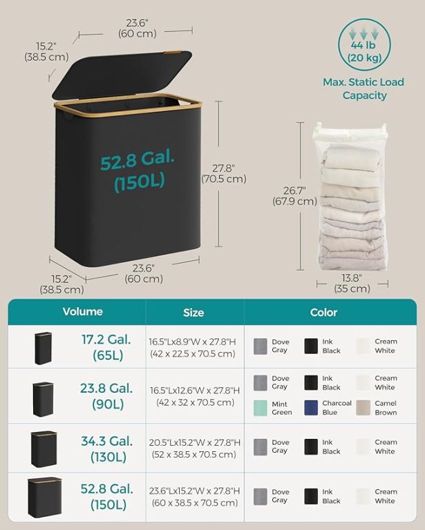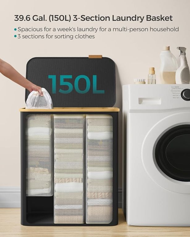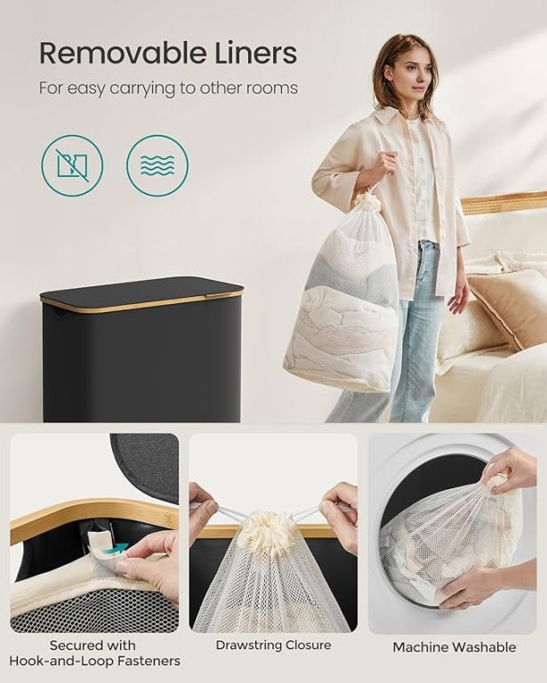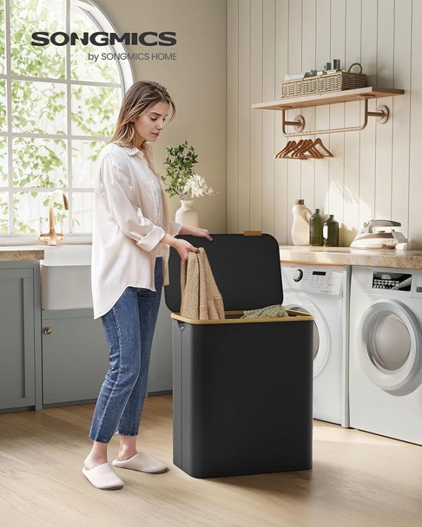 Élvezze a rendet és a stílust minden otthonban ezzel a tágas, 150 literes szennyestartóval. Három különálló rekeszének köszönhetően könnyedén szétválogathatja az egész család szennyesét, míg a letisztult fekete dizájn bambuszkerettel bármilyen helyiségben kiemelkedik. A praktikus fedél védi a magánéletét, és elrejti a ruhákat a szem elől és a portól.