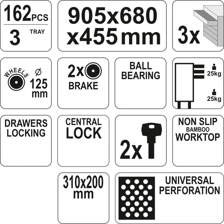 Tároló szerszámos szekrény kerekkel, A felső lap olajálló acélból készül. Az oldal perforált a kiegészítők függesztéséhez