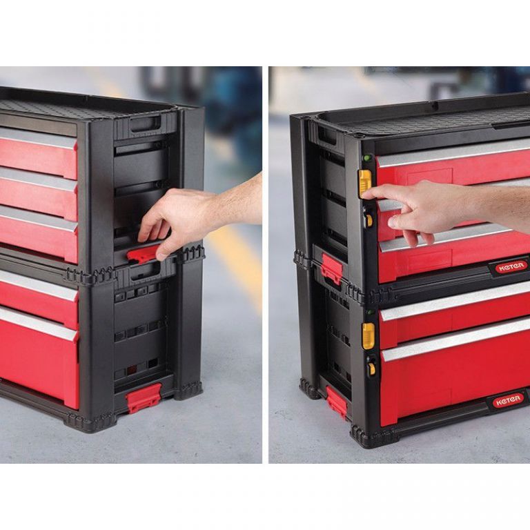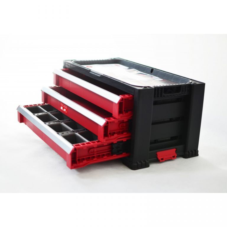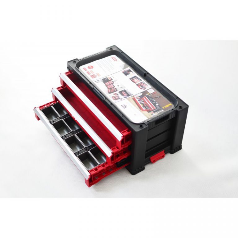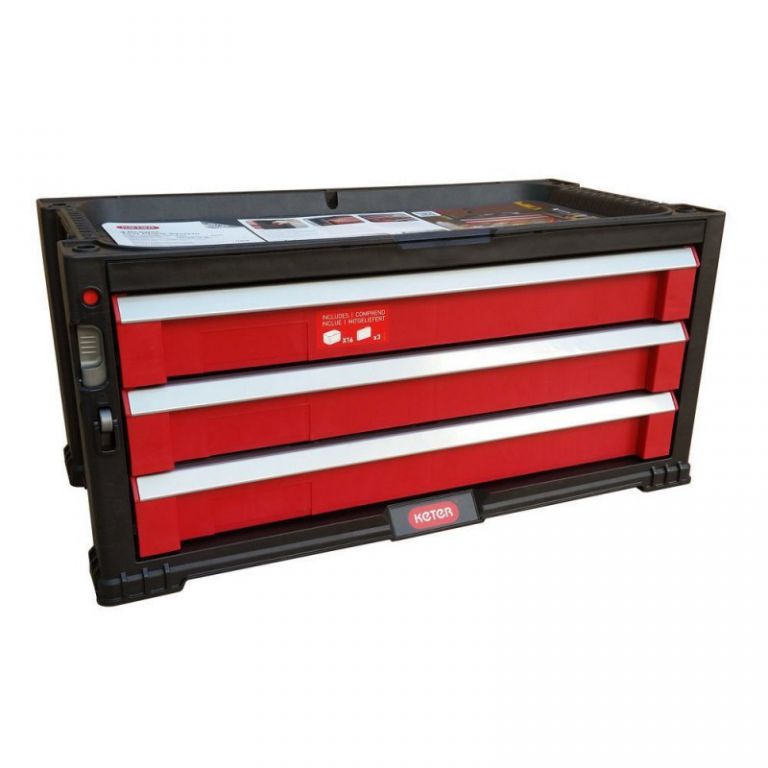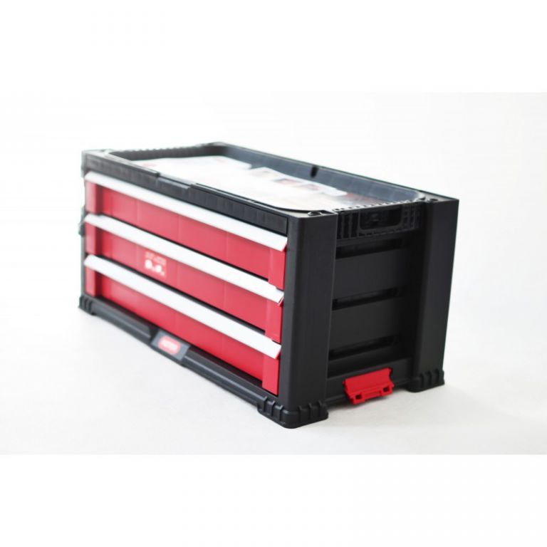 Háromfiókos szerszámtároló doboz forgó kerekeken. Tartalmaz egy nagy fiókot melyből eltávolítható a válaszfal a hoszabb szerszámok helyigénye érdekében. A csomag tartozéka 16 drb kivehető szerszámtároló dobozka, mely kisebb szerszámok tárolására szolgál. Kombinálható a következő dobozokkal 220448 és 220449. KETER cég által gyártott minőségi, és praktikus szerszámtároló doboz, melynek segítségével problémamentesen tárolhatjuk nagyobb méretű szerszámainkat.