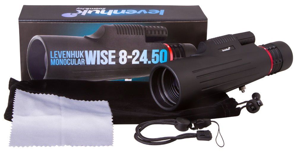 A Levenhuk Wise 8 - 24 x 50 monokuláris távcsöve egy nagy fényerejű optikai műszer 50 mm-es lencsével. Ajánljuk minden túrázás, kalandtúrák, erdei vagy parki séták szerelmeseinek. A változtatható zoom funkcióval rendelkező, kiváló minőségű távcsövek tökéletes rálátást biztosítanak a tárgyakra még nagy távolságból is. Akár 8-24-szeresére is felnagyítja a képet, és így lehetővé teszi, hogy a távoli tárgyak legkisebb részleteit is megtekinthesse. A nagyon rövid fókusztávolság (3 m) részletesen megjeleníti a közeli célpontokat. Használhatja a panoráma közelében található távoli objektumok tanulmányozására, vagy egyetlen cél megfigyelésére jelentős nagyítással. A teljesen bevonatos lencse BaK-4 üvegből készült. A nagy rekesznyílású objektív elegendő fényt rögzít ahhoz, hogy gyenge fényviszonyok mellett is nézzen felhős vagy ködös napon vagy alkonyatkor. A 8-24-szeres tartomány bármely zoomja megváltoztatható a távcsőtest elforgatásával. Hosszabb megfigyeléshez a gyártó menetes állvány (1/4") használatát javasolja. Ennek az optikai műszernek a kompakt és ergonomikus teste tartós könnyű műanyagból készült. A csúszásgátló gumibevonat védi az optikát a rázkódástól és a szennyeződéstől. Ez a kompakt műszer, kisebb és könnyebb, mint a távcső, ideális kellék a turistáknak, kirándulóknak és amatőr ornitológusoknak.