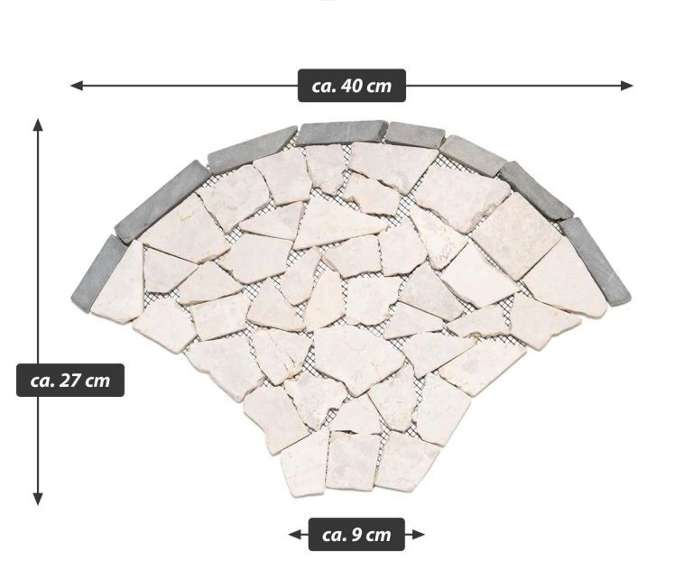 Ez a mozaik finom természetes színeivel meghitt hangulatot varázsol fürdőszobájában, konyhájában, előszobájában, teraszán vagy a ház bejáratában. Kreativitásodnak nincsenek korlátai. Az elegáns természetes kőlapok legyező- vagy halpikkelymintával rendkívüli megjelenést kölcsönöznek. Kézzel ragasztják egy speciális hátlapra a könnyű telepítés érdekében. A törött mozaik csiszolt természetes kövekből készült, szélei lekerekítettek. A hálóra kerek, törött, krémszínű mozaik köveket ragasztanak. Megfelelő megmunkálással a természetes kőmozaik fal- vagy padlóburkolatnak is megfelel, bel- és kültéren egyaránt használható.