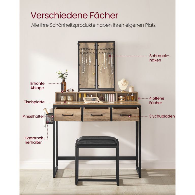 Varázsolja a mindennapi ápolást egyedülálló élménnyé. Ez a három tükrös fésülködőasztal elegendő helyet kínál minden kozmetikai kincsének és ékszerének. A gondosan megtervezett rekeszeknek és fiókoknak köszönhetően minden kéznél lesz, és reggelente mosolyogva indulhat a napja.