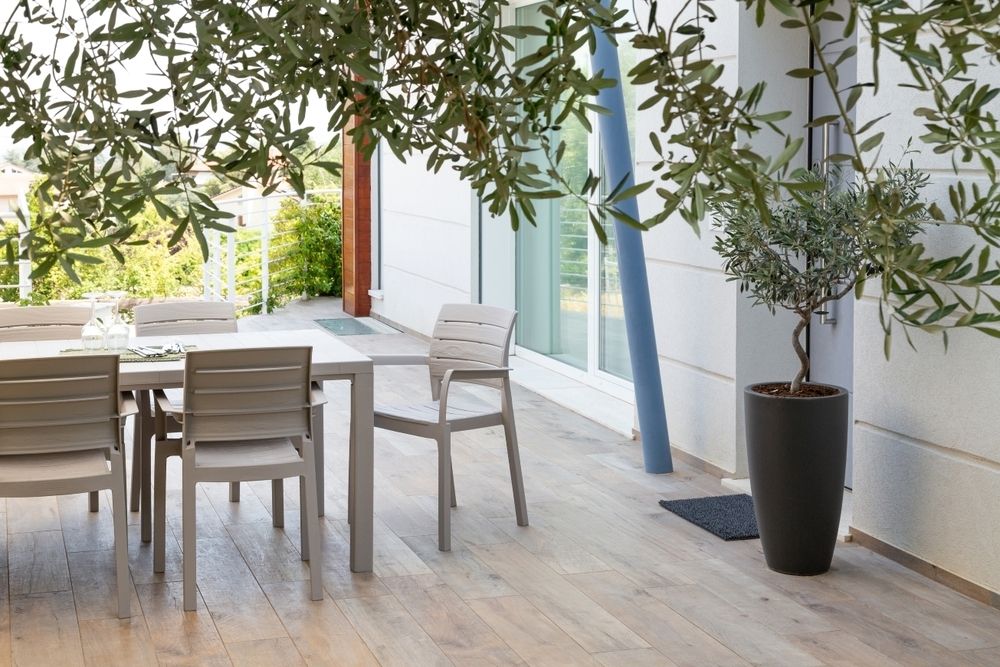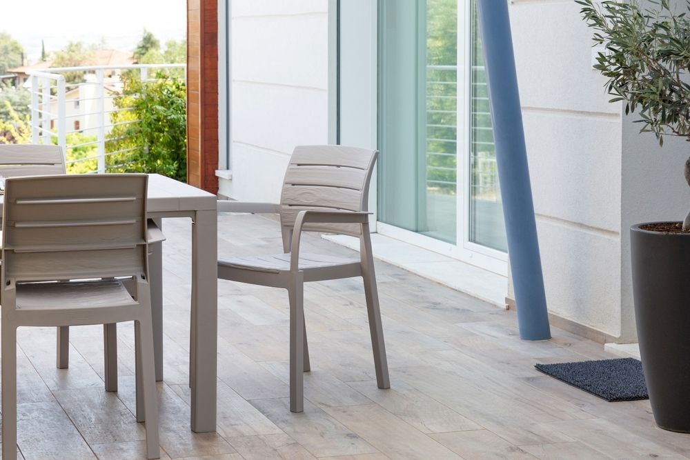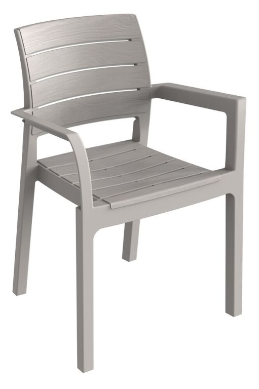 Kényelem és elegancia a kertben! A RECANATI műanyag karosszék karfával könnyű, tartós és ideális a szabadtéri pihenéshez.