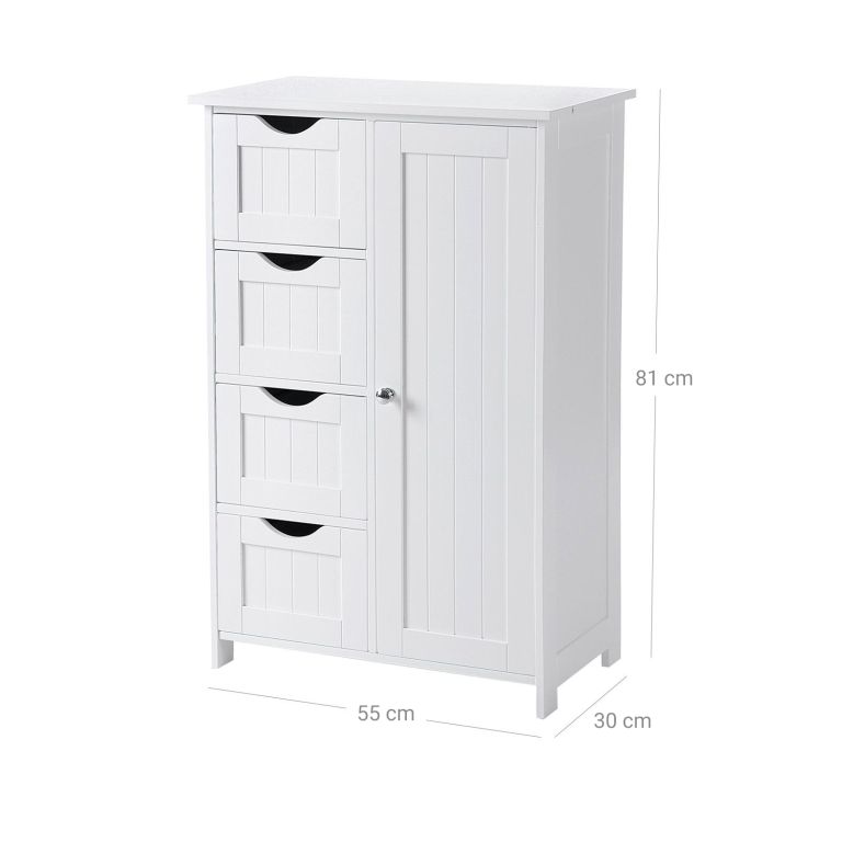 Az 55 × 30 × 81 cm-es méretek rengeteg helyet biztosítanak anélkül, hogy a szekrény plusz helyet foglalna el. Négy praktikus fiók ideális kisebb tárgyak számára, míg az ajtó mögött egy állítható polcot talál, amely magasabban és alacsonyabban elhelyezett tárgyakhoz igazítható. A stabil MDF szerkezet erős és tartós, és felborulás elleni biztonsági funkcióval is felszerelték. Súlya 13,7 kg, mégis kompakt méreteinek köszönhetően kisebb helyiségekbe is alkalmas.