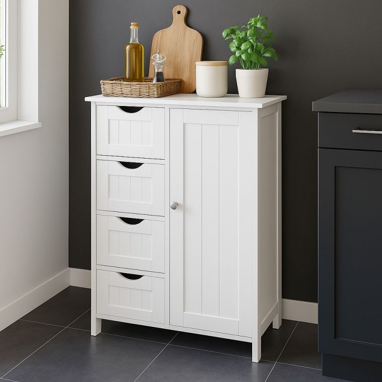 Tartsa kéznél a törölközőket, evőeszközöket és élelmiszerkészleteket – ez a fehér szekrény segít rendben és szervezetten tartani konyháját. Friss megjelenésének és egyszerű kialakításának köszönhetően modern és klasszikus konyhákba egyaránt illik, és könnyen illeszthető más bútorokhoz. Letisztult dizájnja egyszerre elegáns és univerzális, így használhatja előszobában, kamrában, fürdőszobában, hálószobában vagy gyerekszobában.