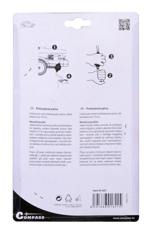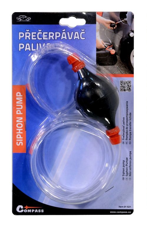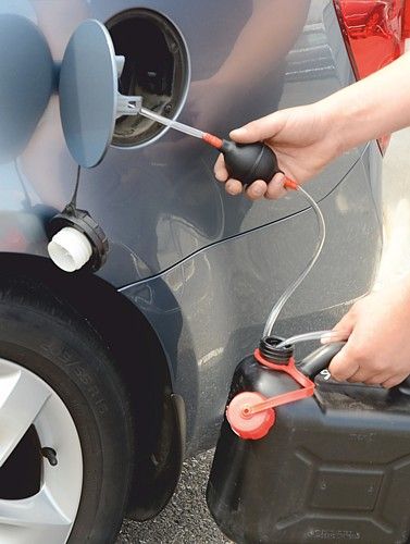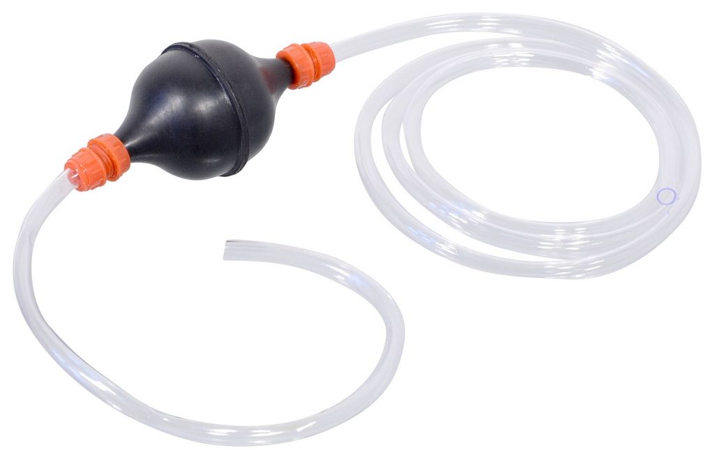 Szivattyú, kézi üzemanyag-szállításhoz kb. 180 cm-es tömlővel. Engedje el az ujját, és hagyja, hogy a folyadék a gravitáció hatására kifolyjon a céltartályba. Annak érdekében, hogy a folyadék gravitációs úton áramolhasson, a céltartálynak alacsonyabban kell lennie, mint a forrásedény.