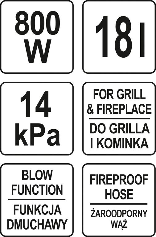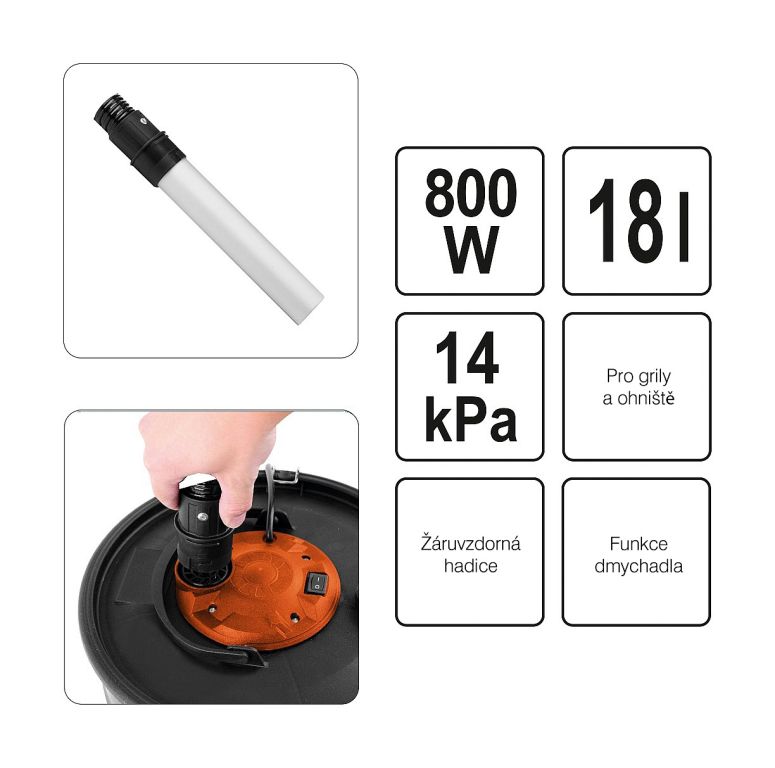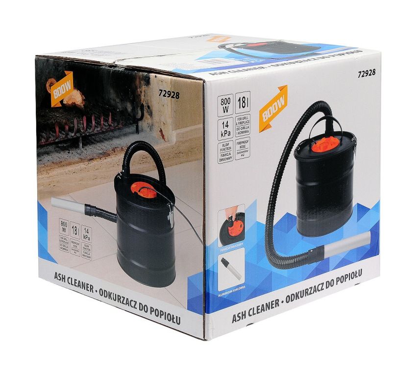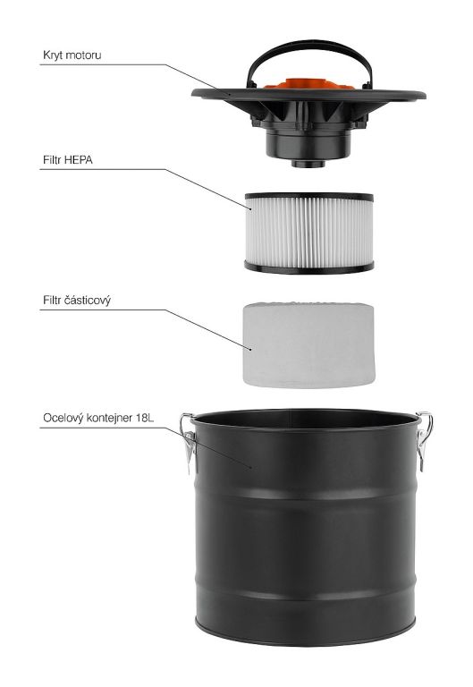 A szívótömlő hőálló és alumínium szívófúvókával van ellátva. A hamutartály rozsdamentes acélból készült, és 18 literes űrtartalommal rendelkezik.