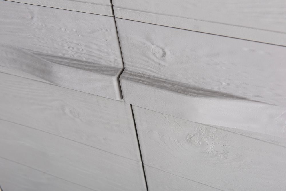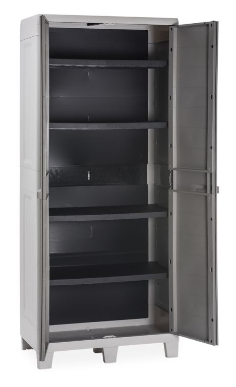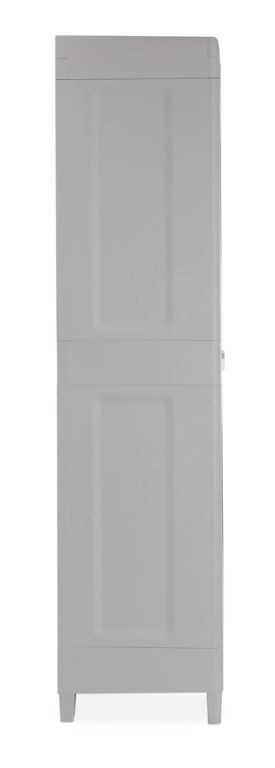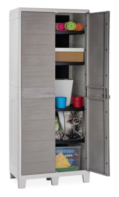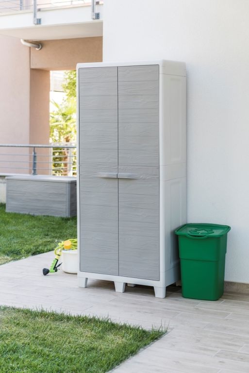 Fedezze fel a tökéletes megoldást kertje számára divatos kivitelű, magas, kétajtós műanyag szekrényünkkel, két elegáns világosszürke árnyalatban. A fafelület valósághű utánzatának köszönhetően a praktikum és a stílusos esztétika kombinációját kínáljuk a természethűséggel.