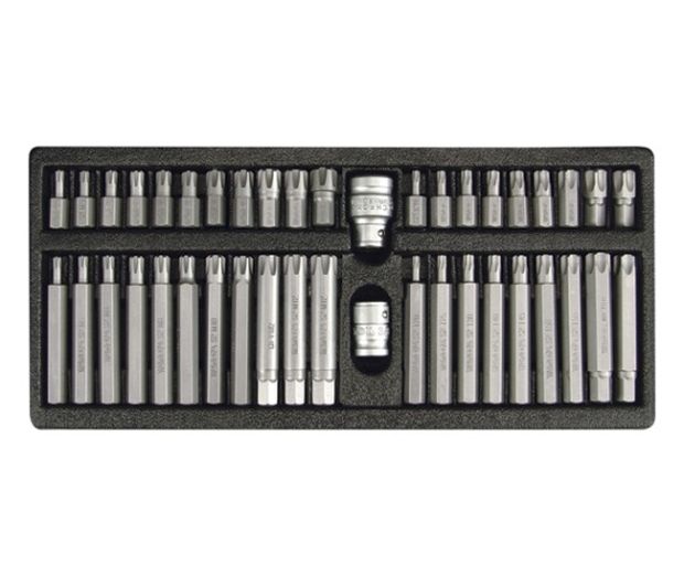 Ez a készlet profik, különösen a szerelők számára alkalmas. A bitek az adapterekkel együtt racsnis munkavégzéshez igazodnak Az egyes szerszámok erősen ötvözött, szerszámozott S2 acélból készülnek, melyet nagy keménység, finomszemcsés anyagszerkezet és nagy nyomaték jellemez. Mindez problémamentes és hosszú távú termékélettartamot biztosít.
