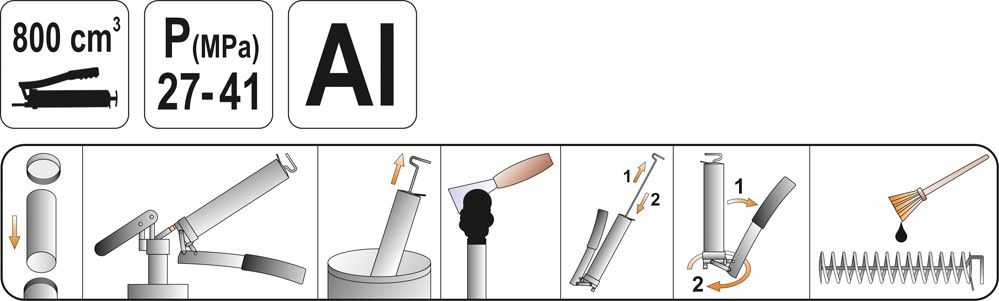 Karos kenőanyag, 800 ml-es kenőanyag mennyiséghez. Fém kivezetéssel ellátott gumitömlővel van felszerelve az úgynevezett szúrós kenőanyagokhoz. A kenőanyag nyomónyomása 27 - 41 MPa.